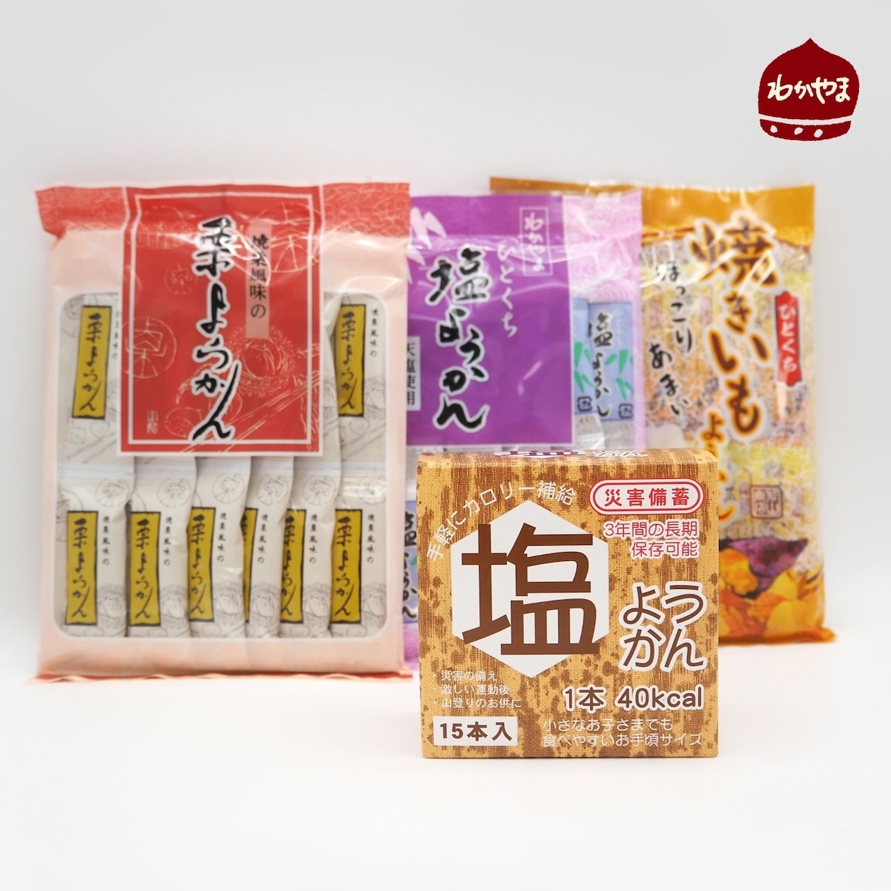 賞味期限は、塩ようかん・栗羊かん・焼いもようかん240日、災害備蓄用塩ようかん3年です。